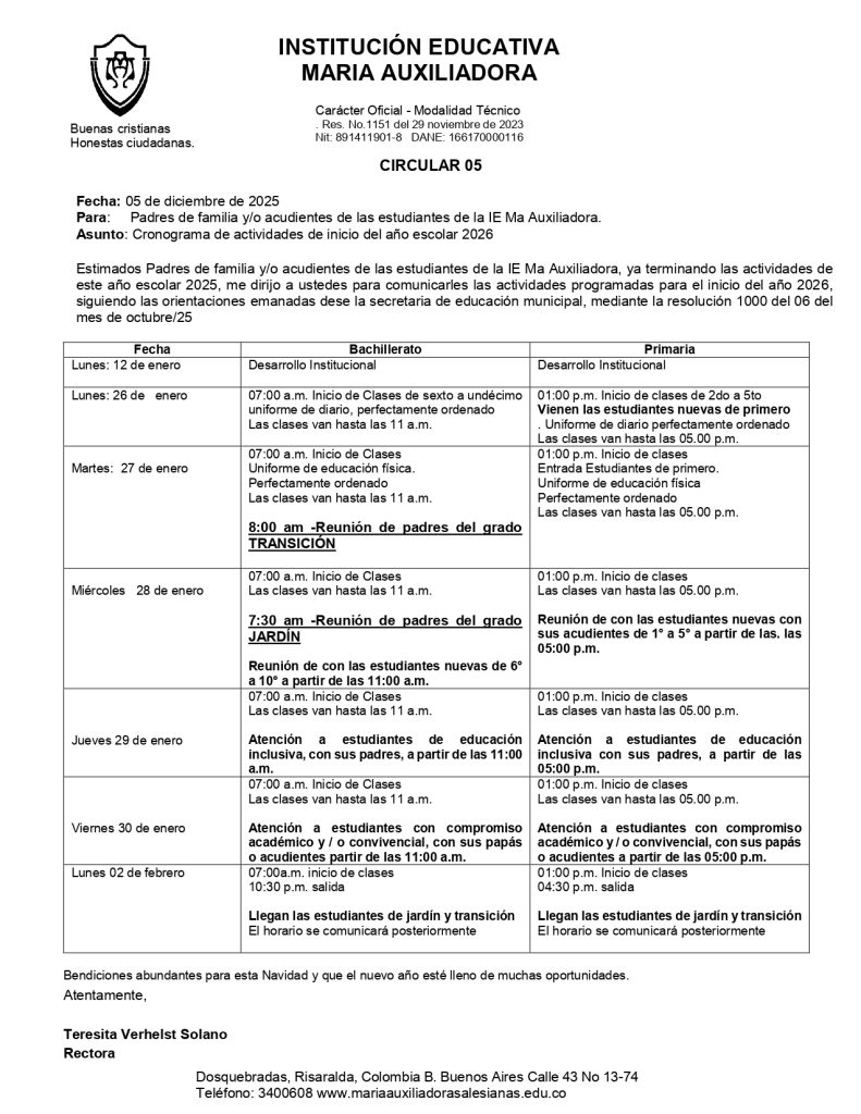 CIRCULAR -CRONOGRAMA INICIO DE AÑO 2026