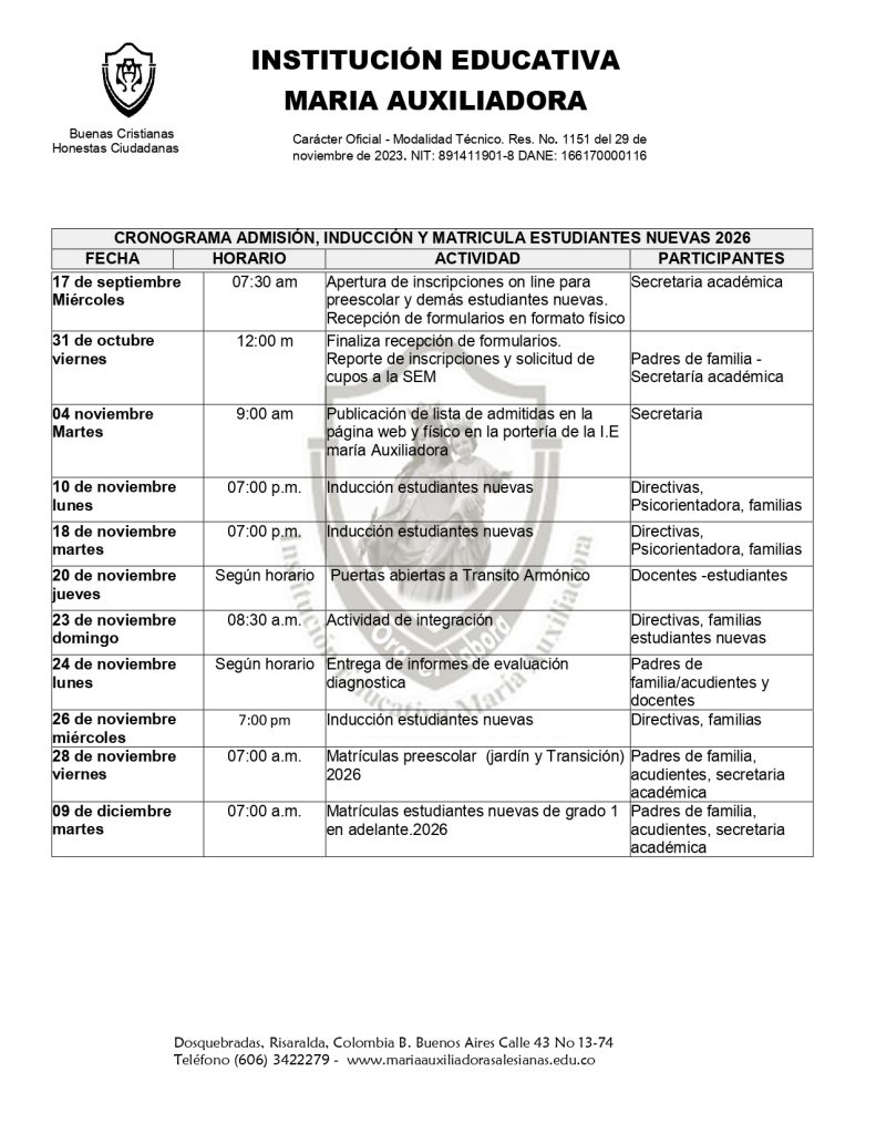 CRONOGRAMA ADMISIÓN, INDUCCIÓN Y MATRICULA ESTUDIANTES NUEVAS 2026