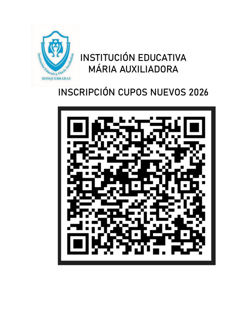 DEL GRADO JARDÍN HASTA EL GRADO 10°, PODRÁN REALIZAR LA INSCRIPCIÓN POR MEDIO DEL CÓDIGO QR EN (www.mariaauxiliadorasalesianas.edu.co) O ADQUIRIR EL FORMULARIO EN LA PORTERÍA DE LA INSTITUCIÓN A PARTIR DEL 17 DE SEPTIEMBRE, SOLO PARA PERSONAS QUE NO TENGAN ACCESO A INTERNET.